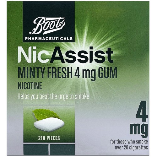 - Boots NicAssist Minty Fresh 4mg Gum is for the relief and/or prevention of the symptoms of nicotine withdrawal and cravings for nicotine