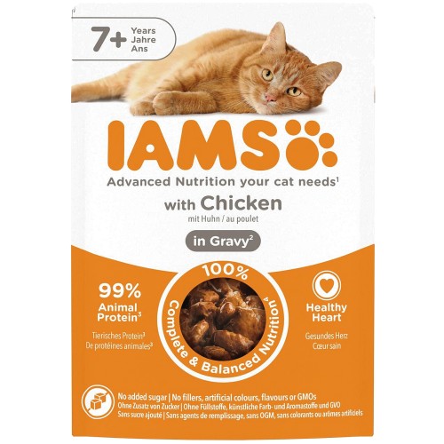 - Delicious senior cat food with succulent chicken in gravy