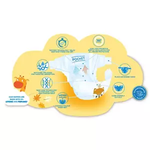 Size 1 New Baby Nappies, 24 pack. Pee Zones – Boy & girl pee zones for targeted absorption. Leak Lock Pockets – To help with leakage & poo explosions . 360 degree leakage protection. Place anywhere tapes for speedy changes. Wetness indicator changes colour when wet. Cord friendly cut-out . DryFast technology – Helps keep baby fresh & dry. All round gentle softness.