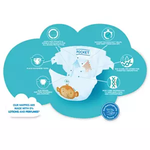 Size 4+ Nappies, 78 pack. Our fastest absorbing nappy ever!!. Boy & Girl Pee Zones for targeted absorption. The same size nappy as the standard size nappy but with extra absorbency. Leak Lock Pockets – Protective pockets front and back to help with leakage & poo explosions. Place anywhere tapes for a speedy change. Up to 12 hours dryness, day & night. Dryfast Technology helps keep baby fresh and dry. Slim design for free movement & comfort.
