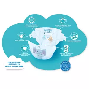 Size 5+ Nappies, 64 pack. Our fastest absorbing nappy ever!!. Boy & Girl Pee Zones for targeted absorption. The same size nappy as the standard size nappy but with extra absorbency. Leak Lock Pockets – Protective pockets front and back to help with leakage & poo explosions. Place anywhere tapes for a speedy change. Up to 12 hours dryness, day & night. Dryfast Technology helps keep baby fresh and dry. Slim design for free movement & comfort.