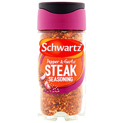 • Schwartz steak seasoning is blended with black pepper, garlic and ground coriander seeds.