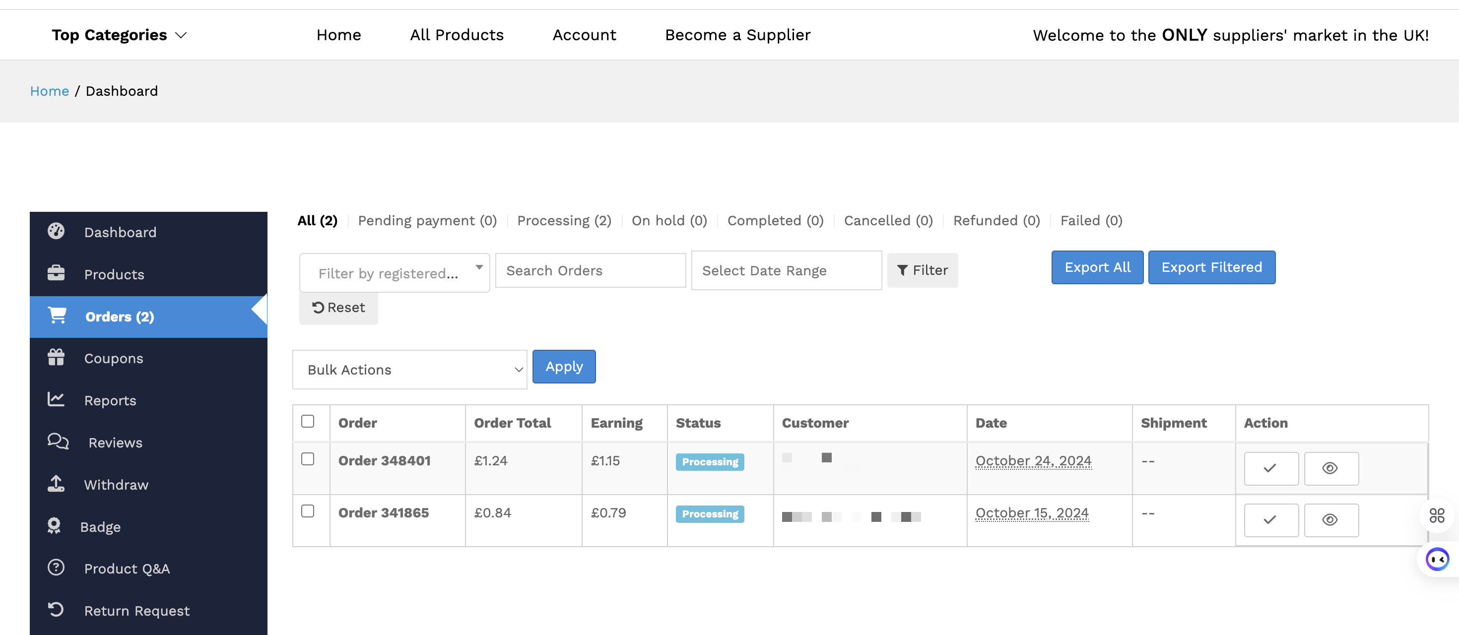 - Log in to your supplier account and navigate to the Dashboard.